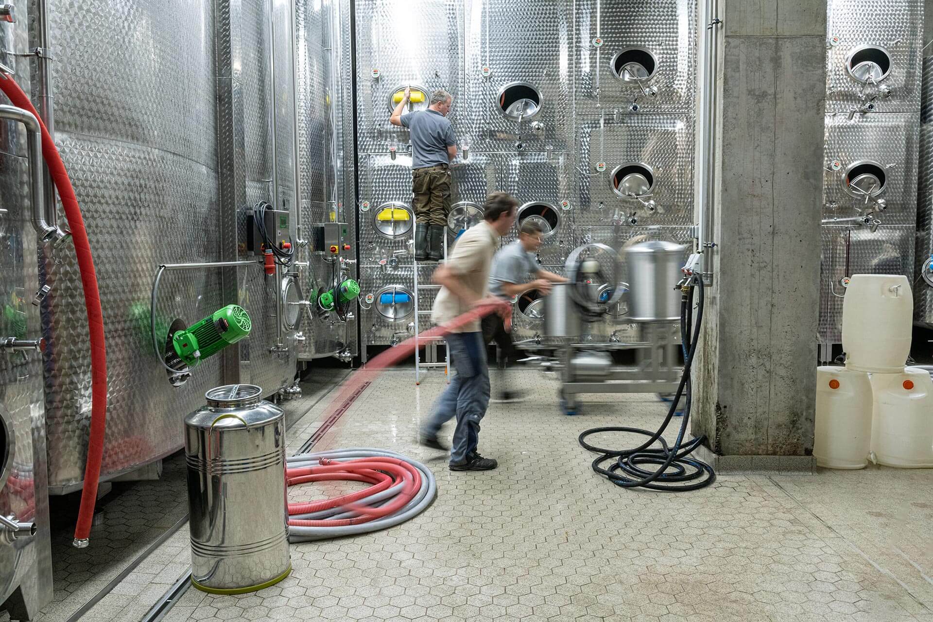 Blitzblanke Stahltanks und präzise Kellertechnik sind unser Werkzeug, um Frische und natürliche Aromen zu bewahren. Weißweine vergären wir kontrolliert, kühl und langsam im Tank — bis zur Abfüllung reifen sie auf der Feinhefe und gewinnen so an Harmonie. Rotweine hingegen vergären traditionell offen auf der Maische, werden zweimal täglich von Hand gestampft und durch biologischen Säureabbau weich und samtig.